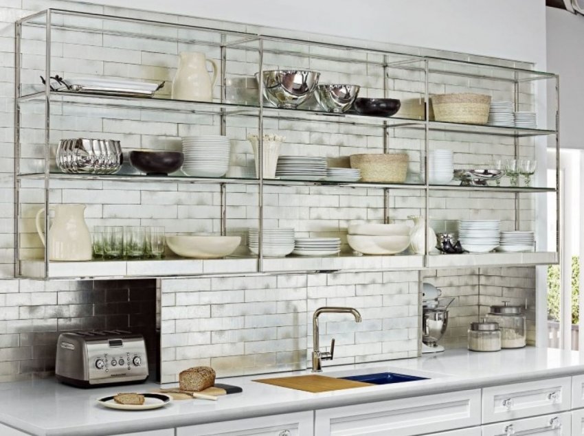 Конечно же, не обойтись без полок и в сердце нашего дома, а именно – на кухне. Здесь как нельзя кстати окажутся самые разнообразные изделия. Выберете деревянные полки – не ошибетесь. Они достаточно надежны и подойдут в интерьер в стиле кантри. Но если при создании интерьера вы придерживались стиля хай тек, то стеклянная мебель, оригинальные полки – ваше правильное решение. На них прекрасно смотрится изящная посуда, разнообразные аксессуары, которые только внесут дополнительный шарм в это помещение.