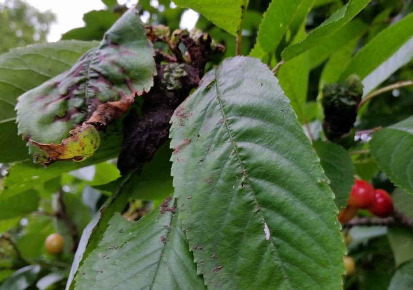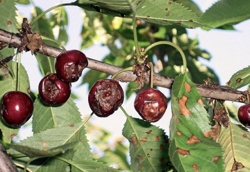 - Коккомикоз. Возбудитель – грибок. Споры, перезимовав под корой, в почве или камеди. На листьях появляются красноватые мелкие пятна. Они растут, сливаются и превращаются в уплотнения серого цвета. Лечение – трехкратная обработка фунгицидами с интервалами в 5 дней. Присыпают приствольный круг древесной золой.