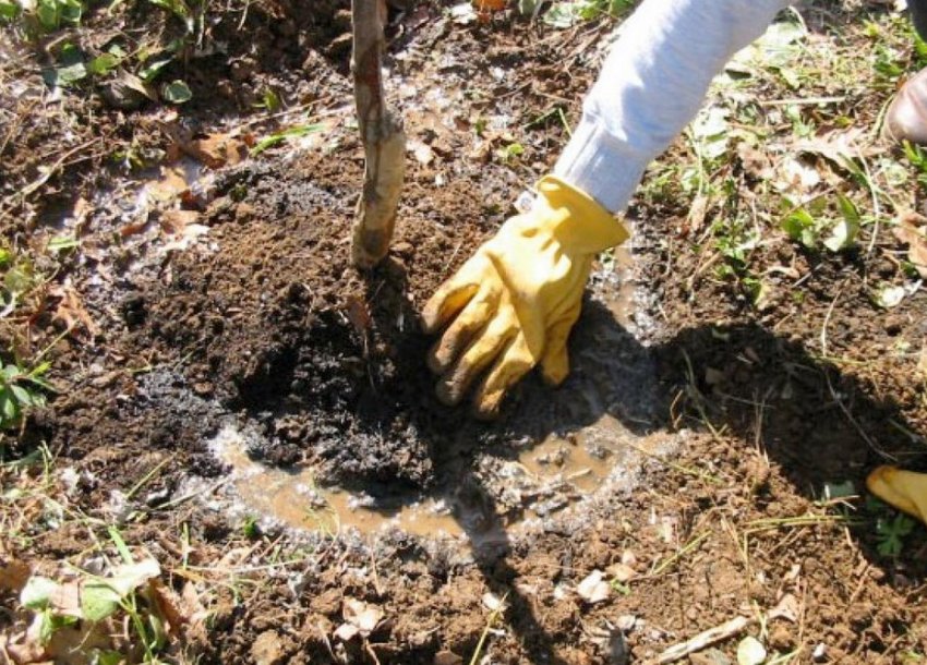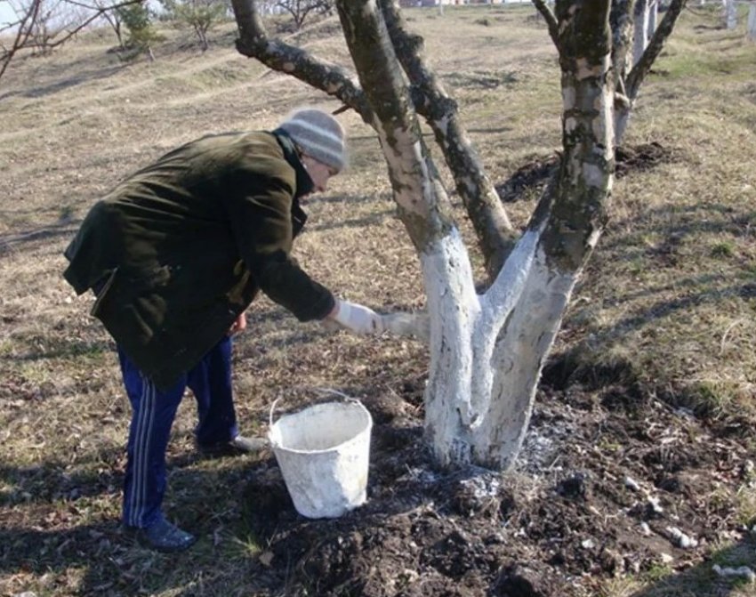 На заметку!Эффективнее обработка станет, если в известковый раствор добавить фунгицид или инсектицид. Подобный состав уничтожит вредителей, которые успели забраться под кору и их не видно вооруженным взглядом.