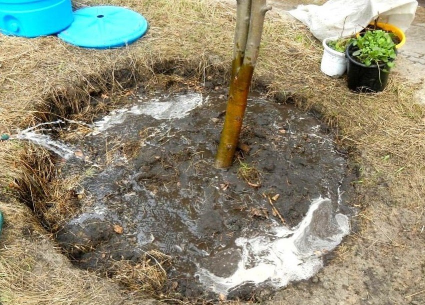 В лунку около ствола вливают воду до полного заполнения. После того, как вода впитается, поливают снова. Под каждое дерево выливают около 200 л. Такое хорошее увлажнение создаст хорошие условия для зимовки дерева.