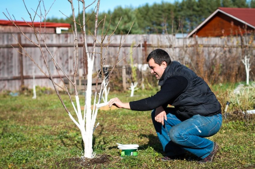 - Штамб и нижнюю часть ветвей окрашивают на высоту руки (куда получится достать, но не дальше 2 м).