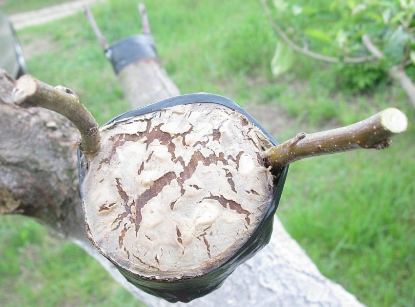 Через 1.5 -2 недели можно оценить первый результат и проверить прижился ли материал. Если он потемнел или легко отделяется от материнского дерева, значит, он не прижился. Черенок удаляют, место повреждения снова обрабатывают садовым варом. Если он дал рост, почки набухли, то защитную пленку можно удалить, чтобы она не тормозила рост новой ветки.