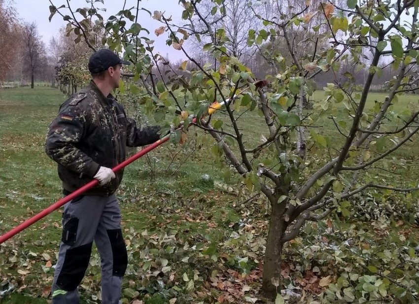 - Убирать опавшую листву и гнилые плоды. Не оставлять их на зиму, так как это идеальная среда для зимовки вредителей и спор грибковых болезней. Все остатки желательно сжечь.