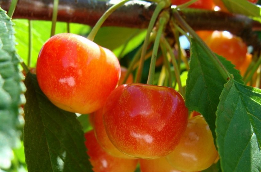 Отечественный сорт, выведен в 90-е годы. У него золотисто-желтые ягоды среднего размера. Вес одной ягоды – 4,5-4,8 г. Сахаров – 12%. Главный недостаток «Рондо» – непригодность для перевозок. Плоды слишком нежные и при транспортировке мнутся и текут. Зато эта черешня скороплодна и урожайна, стойко переносит засухи и морозы, не боится грибковых инфекций.