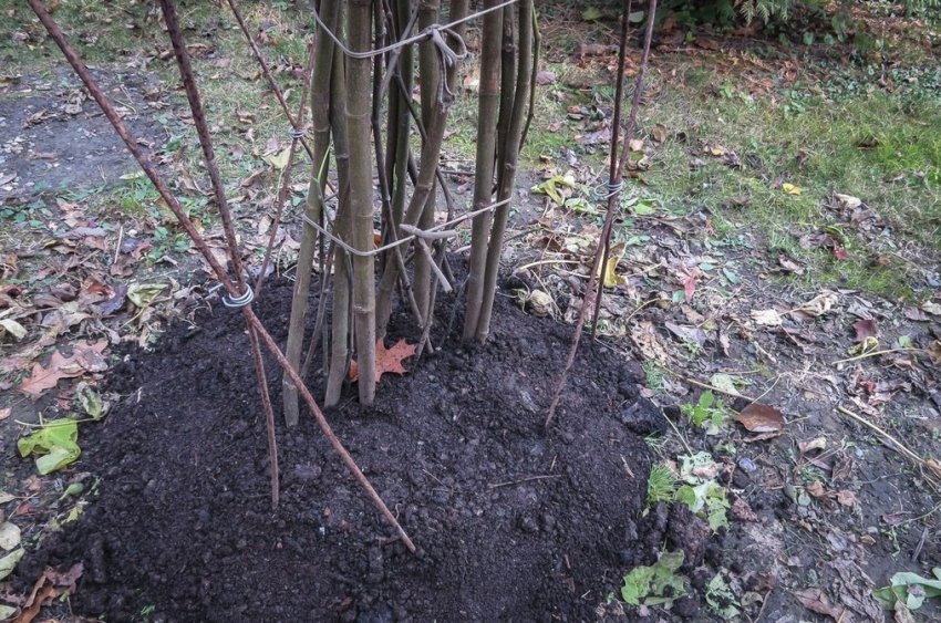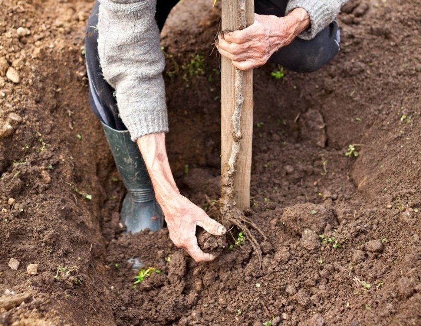 - На дно устанавливают колышек для подвязки, выкладывают субстрат из грунта (5 кг), перегноя (5 кг), древесной золы (300 г), суперфосфата (150 г).