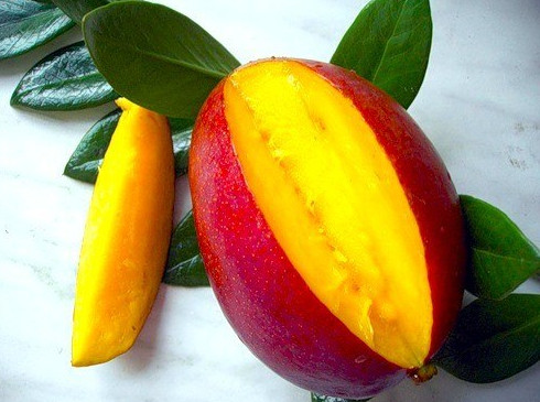 Плоды манго имеют овальную форму. Их цвет варьируется от красного и желтого до зеленого (в зависимости от сорта). Мякоть манго – сочная, мясистая и волокнистая, ярко-оранжевого цвета. По вкусу фрукт напоминает одновременно персик и ананас. Всего известно более 70 сортов. Но большинство из них – кормовые и не пригодны к употреблению людьми. Такие плоды даже не срывают с дерева.