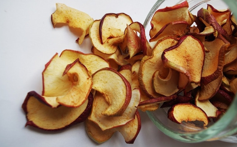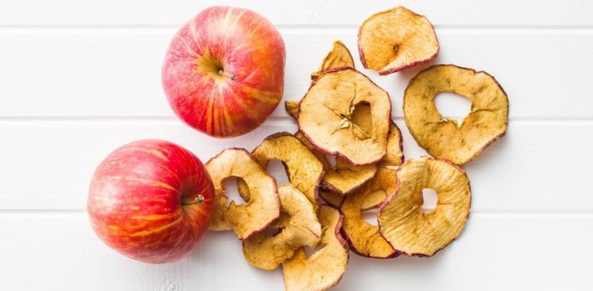 - Сушеные. С развитием современных технологий появилось множество способов сделать сухофрукты из яблок. Наиболее популярные способы – в духовке, специальной электрической сушилке, микроволновой печи, на открытом воздухе. Лучше всего выбирать ранние сорта с тонкой кожицей, например, Антоновку или Апорт. Нарезают их тонкими ломтиками или колечками, а затем обрабатывают лимонным соком или раствором поваренной соли. После этого выкладывают на противень и высушивают.Такой продукт содержит огромное количество калия, марганца, магния, железа. В самостоятельном виде является полезным и сытным перекусом. Может использоваться для приготовления компотов, выпечки и других блюд.