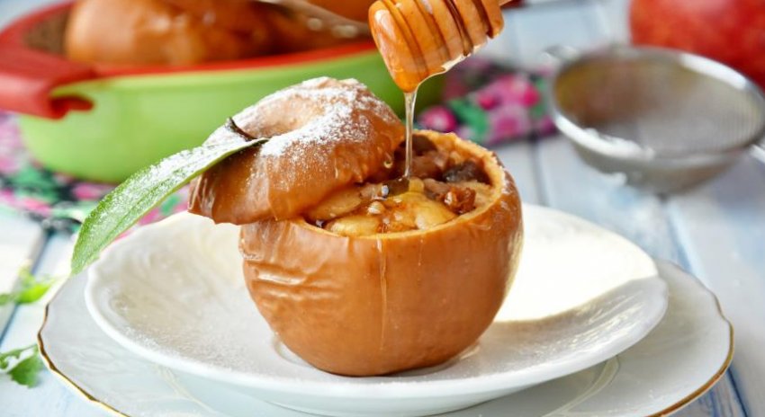 - Запеченные в духовке. Для запекания используют яблоки любых сортов, однако лучше всего выбирать непереспелые, твердые плоды без повреждений. Предварительно извлекают серединку с косточками. Чтобы сохранить максимальные полезные свойства, не стоит добавлять сахар. Такой продукт легко усваивается, а его употребление не сопровождается повышенным газообразованием. Это позволяет использовать яблоки в диетическом и детском меню. Употребляют их в качестве самостоятельного десерта, добавляют к кашам или выпечке.
