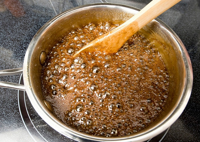 - Емкость поставить на средний огонь и стараться не размешивать. Чтобы сахар не пригорел, емкость можно вращать.