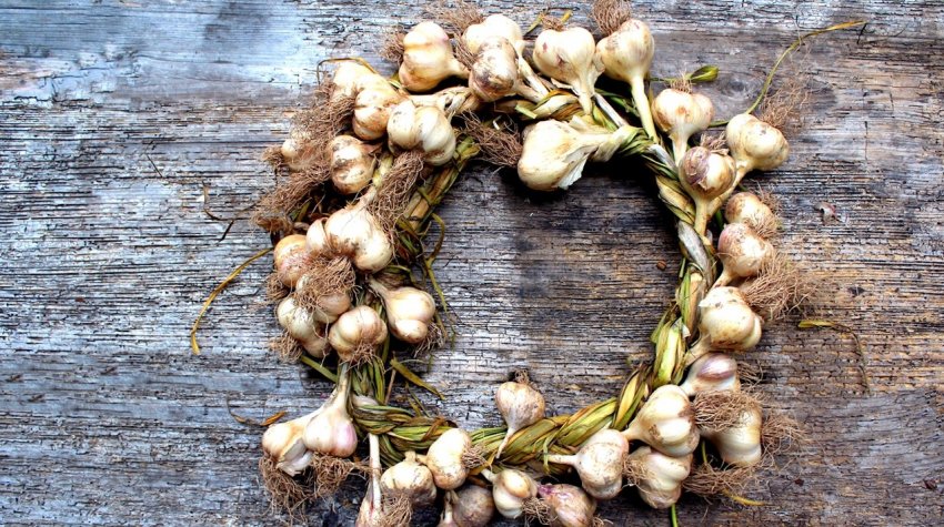 Коса (венок) – красивый старинный, не потерявший актуальности метод хранения чеснока. По завершении просушивания чеснока после уборки стебли не обрезают, а заплетают в косу или венок по 15-20 штук. Чтобы коса выглядела аккуратно, часть листьев перед плетением можно удалить.