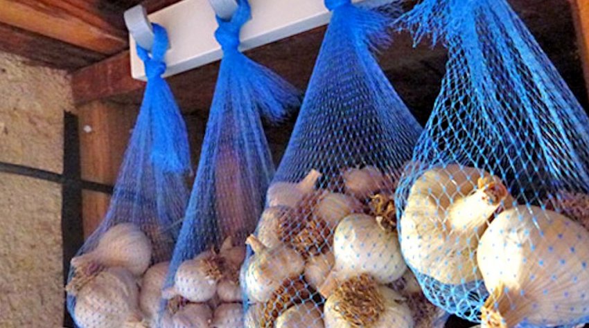 Большой урожай чеснока проще упаковать в сетки для овощей (капроновый чулок) – сетки, как и косы, подвешивают на шесте, на крючки (гвоздики) на стене или просто раскладывают на полки.
