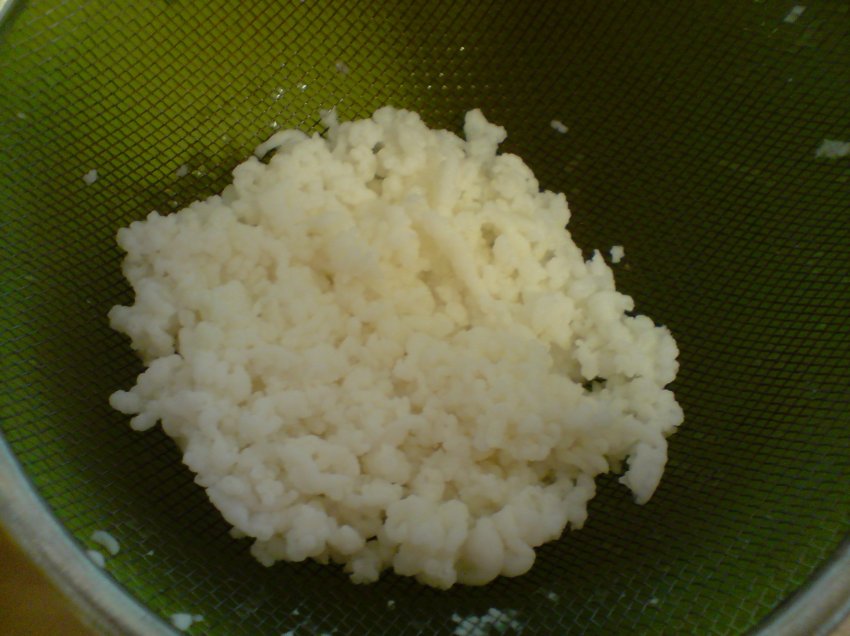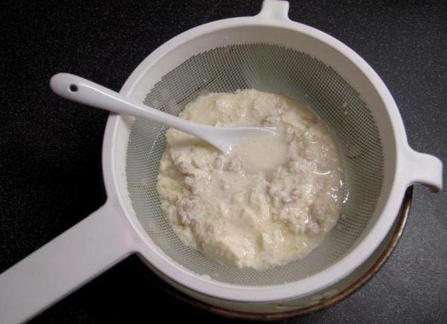 - Если процедура закваски была проведена правильно, по истечении суток на поверхности молока появится густой слой. Полученный кефир сливают через сито, а грибы оставляют для дальнейшего использования.Процеживание кефира