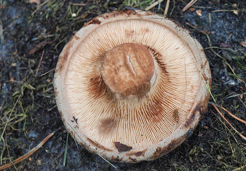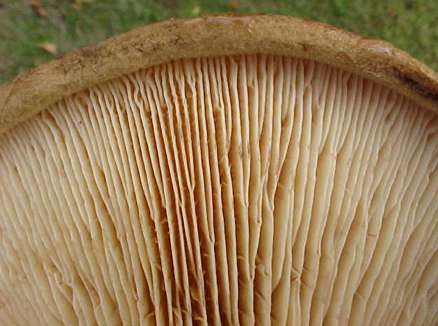При изменении влажности меняется структура поверхности: из гладкой и сухой она превращается во влажную и липкую. Внутренняя часть пластинчатая, желтоватого цвета. Пластинки широкие, нисходящие к ножке. Иногда соединяются перемычками, образуя ячейки. При нажатии на пластинки приобретают темно-коричневый цвет.