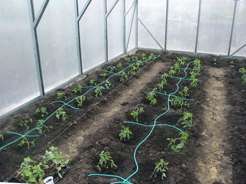 Тепличную постройку лучше располагать с севера на юг. Так, легче размещать грядки. Разбивают 3 узкие гряды, между ними делают маленький проход для ухода и полива. Пользуются высокими грядками, высотой 15 см. Состоят они из садового мусора, слоя земли, затем навоз и снова почва. Такие насыпи получаются теплыми, овощи будут созревать быстрее и не замерзнут ночью.