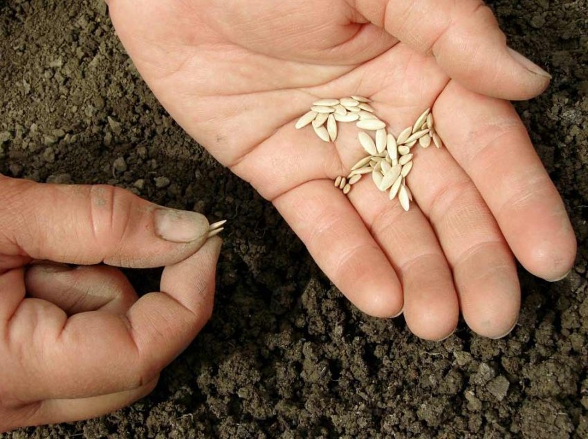 В открытый грунт семена сеют в прогретую землю свыше 15°С днем и хотя бы до 9°С в ночные часы. В теплицы и тоннели (стеклянные либо пленочные) семена закладывают с начала мая. Лунки нужно заполнить смесью торфа, навозного перегноя, речного песка и минеральных удобрений, полить и заглубить семена на 1,5-2 см, затем мульчировать торфом или перепревшим навозом и, если посев произведен в открытый грунт, накрыть пленкой.