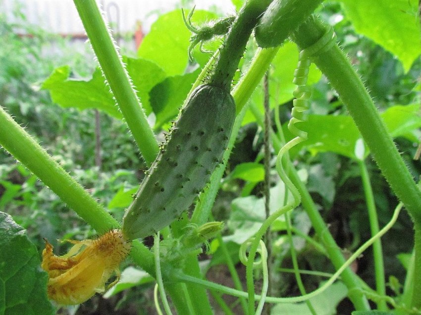 Бабушкин секрет F1 – однолетнее растение, в длину стебель достигает 2 м. Тип плодоношения, называемый пучковым или букетным, внешне похож на грозди бананов. Огурцы называют пикули или корнишоны. Гибрид светолюбивый, пустоцветов практически не образует.