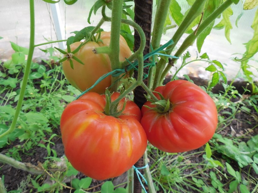 Чтобы получать большие томаты, надо нормировать количество завязей и удалять примерно половину. Если оставить все, то максимальный вес составит не больше 400 г. Подвязывать не только стебель, но и кисти, так как под весом крупных плодов они ломаются.