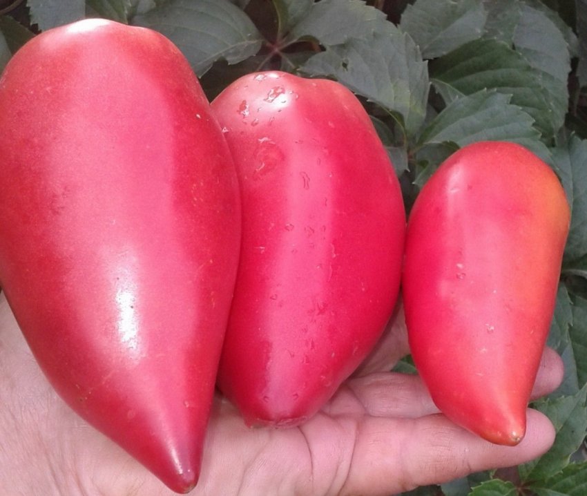 - Томаты удлиненной формы, основной цвет красный с розовым отливом.