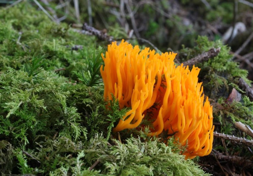 Какие отличительные признаки ложных грибов-кораллов?В лесу часто можно встретить ложный рогатик – калоцеру клейкую, которая относится к условно съедобным видам. Ее ветви слегка клейкообразные и словно светятся изнутри.