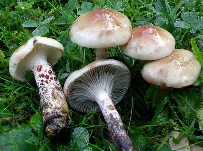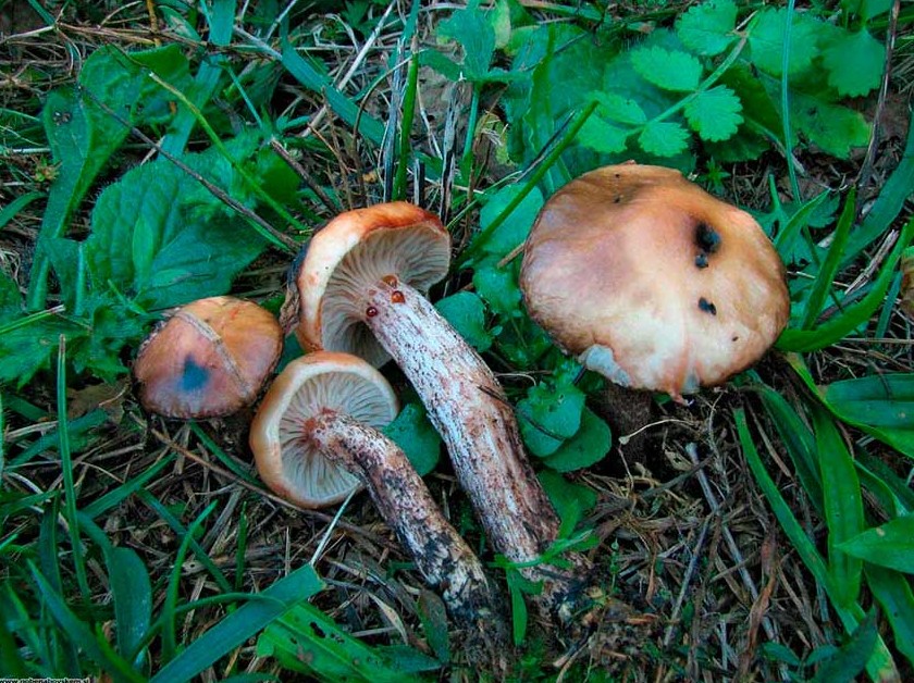 - Шляпка имеет темные коричневые пятна. В месте повреждения становится красной.