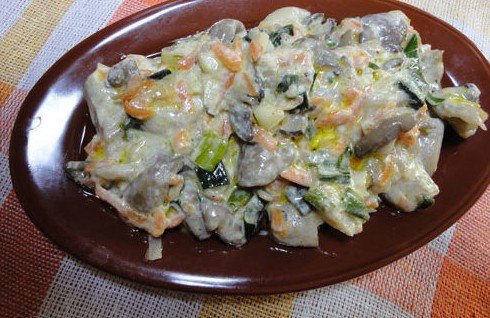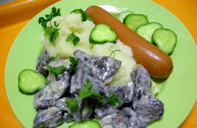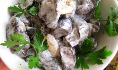 - Чеснок нарезать мелко и смешать со сметаной, добавить к свинухам и тушить на небольшом огне примерно четверть часа.