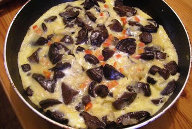 - Влить яйца на сковороду к грибам и луку, накрыть крышкой и готовить на слабом огне до готовности омлета.