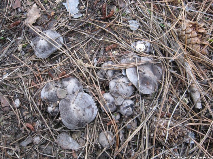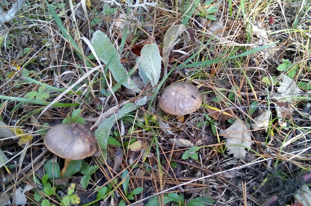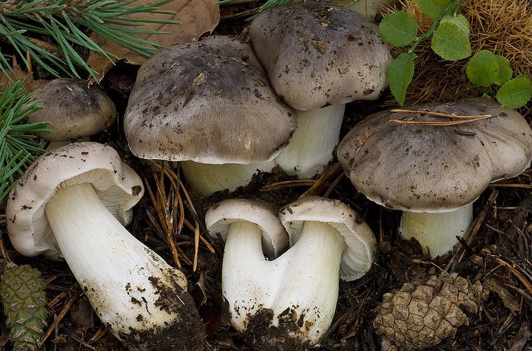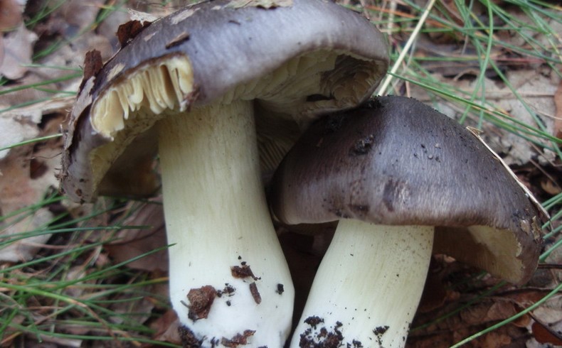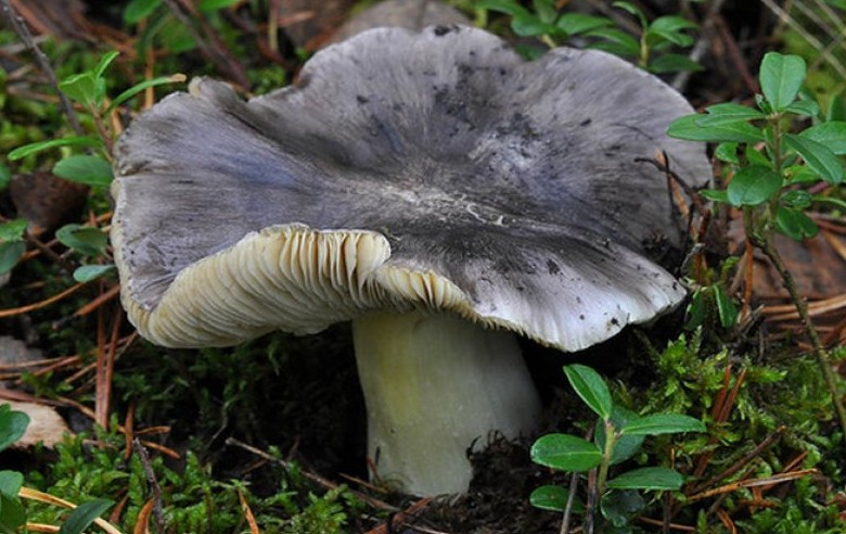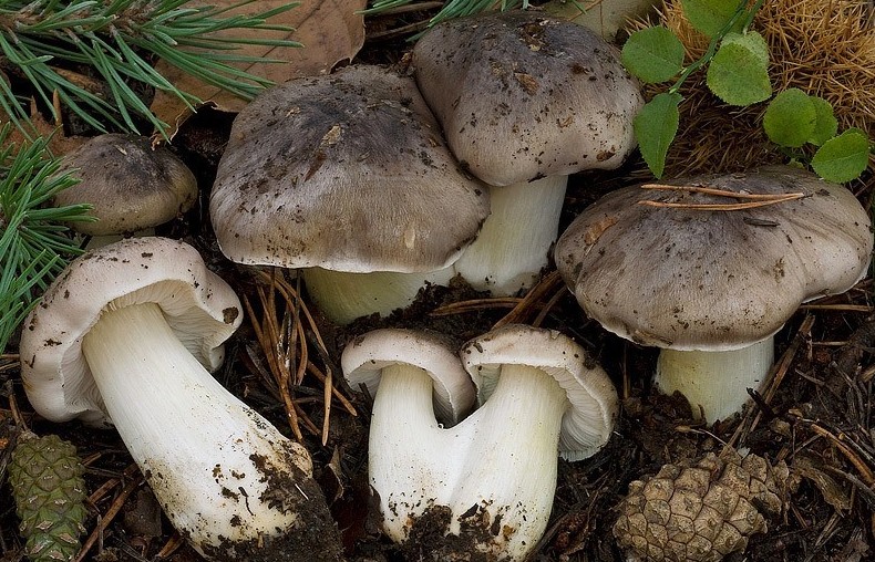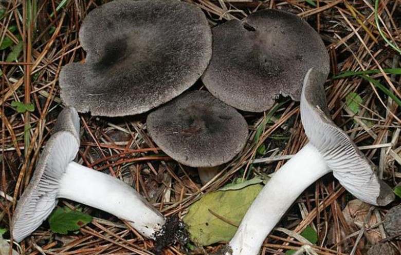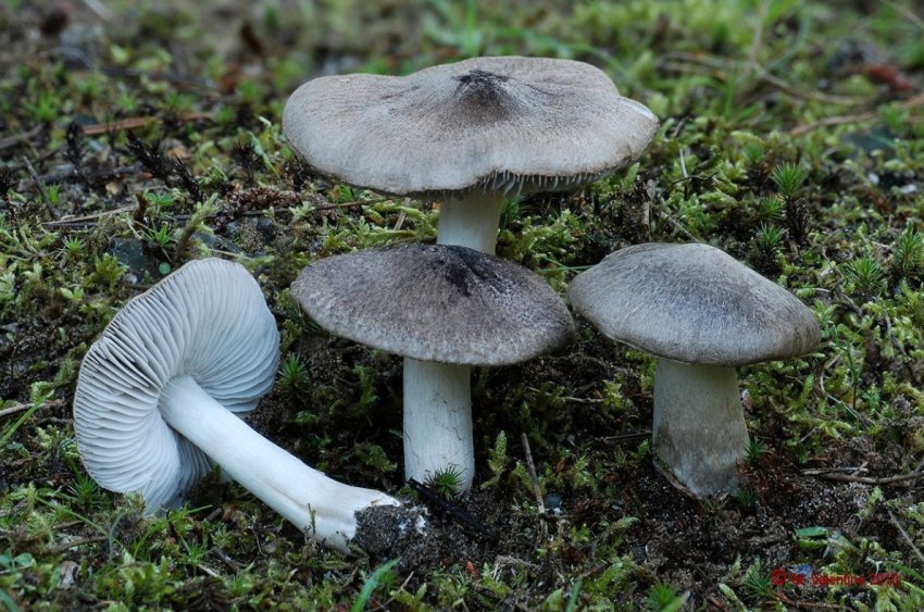 Серая рядовка имеет шляпку округлой формы темно-серого цвета с фиолетовым оттенком, которая по мере роста становится более плоской с небольшим бугорком по центру. У зрелых грибов ее поверхность становится более гладкой, появляются трещины. Мякоть на изломе желтеет. Этот вид растет внутри сосновых лесов. Его можно встретить с начала сентября вплоть до заморозков.