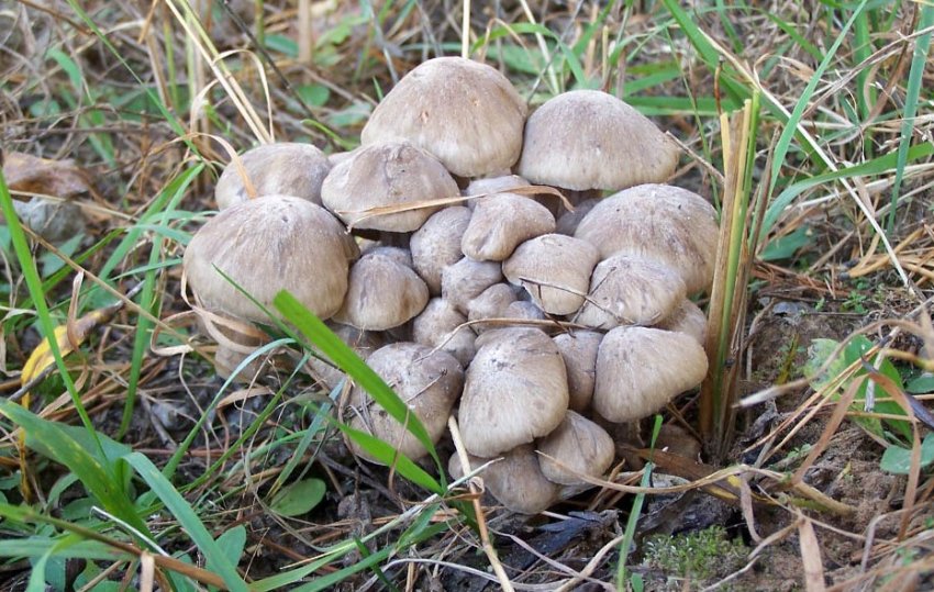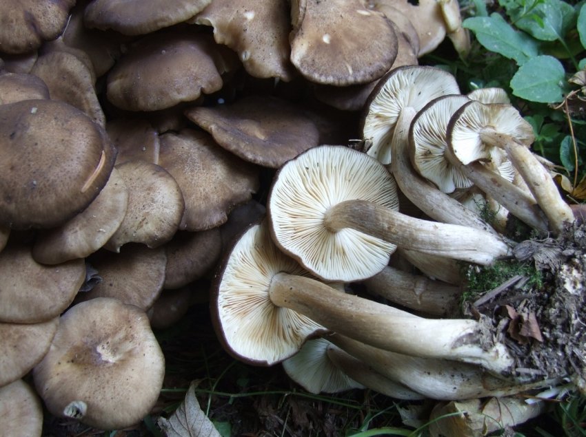Скученная отличается тем, что растет в виде сросшихся плодовых тел сероватого цвета с округлыми шляпками с вогнутыми краями. Упругая мякоть коричневого цвета с мучнистым запахом характеризуется отличным грибным вкусом. Растут в начале осени в смешанных лесах, парках, недалеко от дорог.