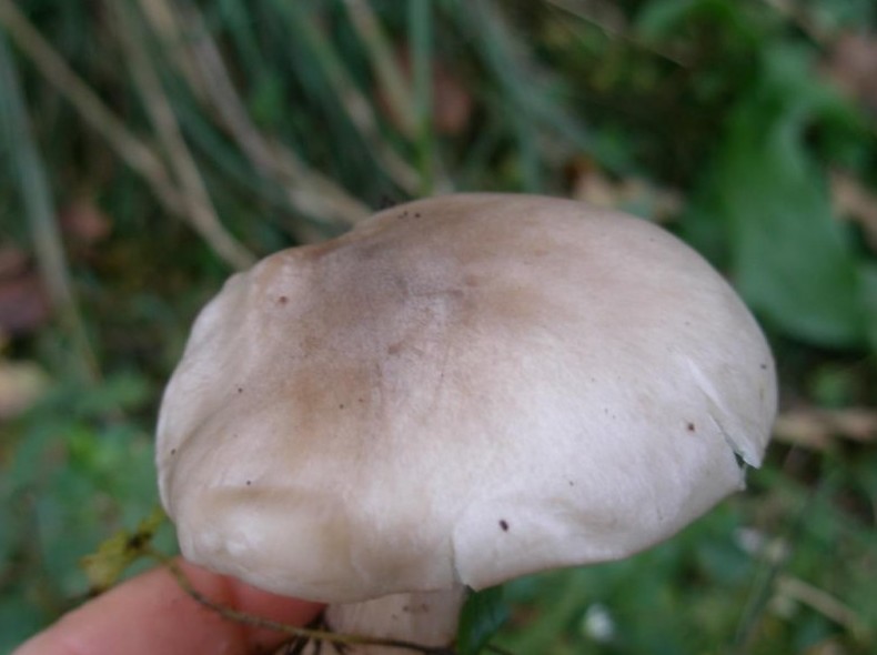 Гладкая сухая поверхность шляпки при дождливой погоде становится клейкой. Со временем она темнеет, и появляются признаки трухи. Съедобная разновидность рядовки серой имеет приятный землистый запах.