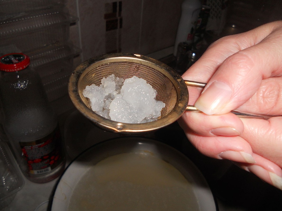К концу срока жидкость сливают в чистую емкость, желательно стеклянную. Сливать нужно аккуратно, используя марлю или очень мелкое неметаллическое сито, чтобы частички «рисовых» зерен не попали в сам напиток.