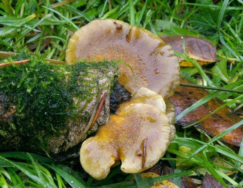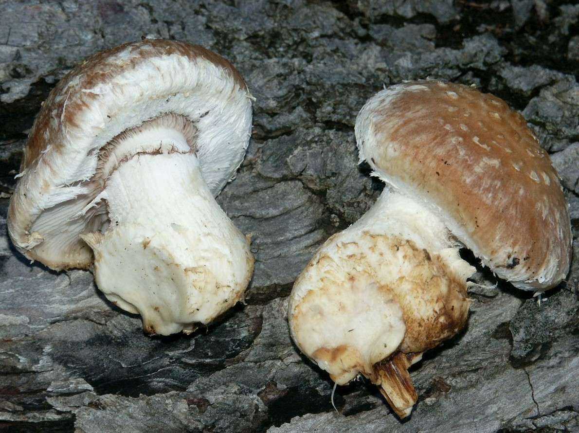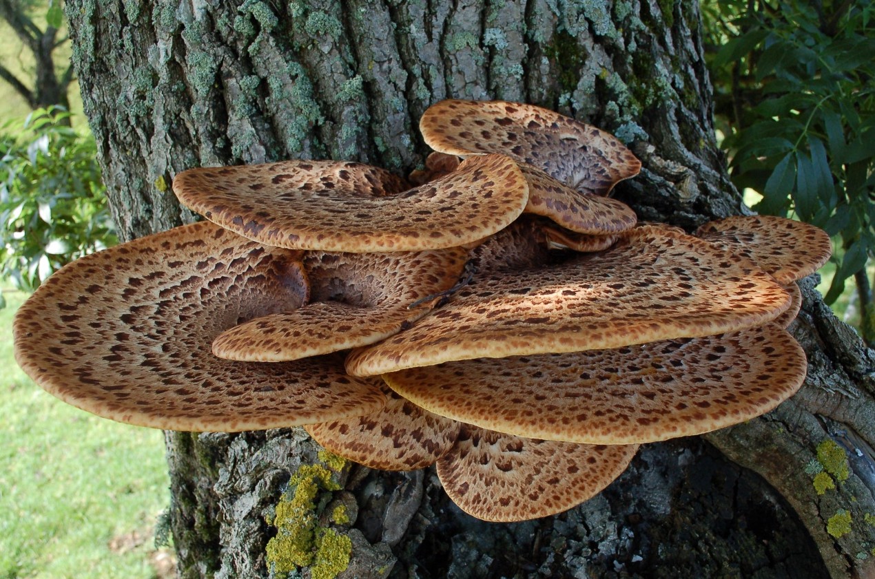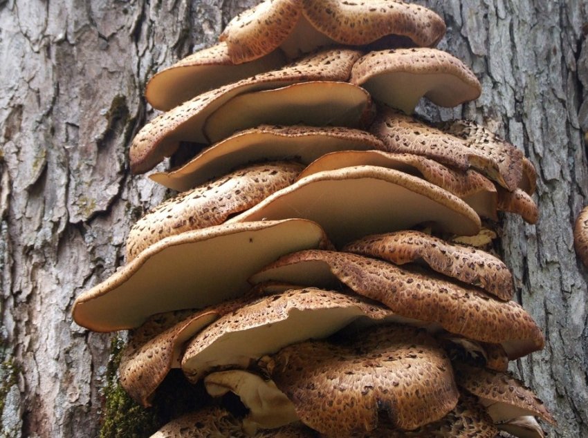 Часто встречается в природе и Трутовик пестрый (чешуйчатый). Располагается он в нижней части дерева, иногда у самой его основы, имеет форму воронки, а со временем выравнивается и становится плоским. Диаметр шляпки может достигнуть 50 сантиметров.