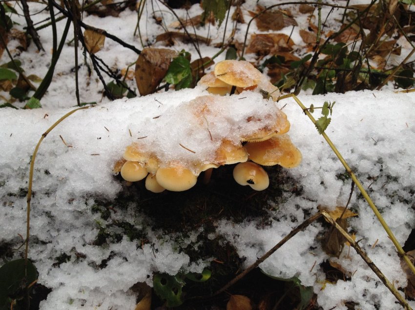 Этот зимний гриб появляется поздней осенью и в начале зимы, иногда даже в конце декабря. Может расти под снегом. Внешне он схож с летним, отличие заключается в наличии ножки с чешуйками и кольцом, а также шляпкой, суховатой на ощупь. Цвет ножки у опенка зимнего темно-коричневый или черный. Ближе к верху он приобретает желтый оттенок. Ножка по длине вырастает от 4 до 8 сантиметров, а толщина в среднем 0,5 см.