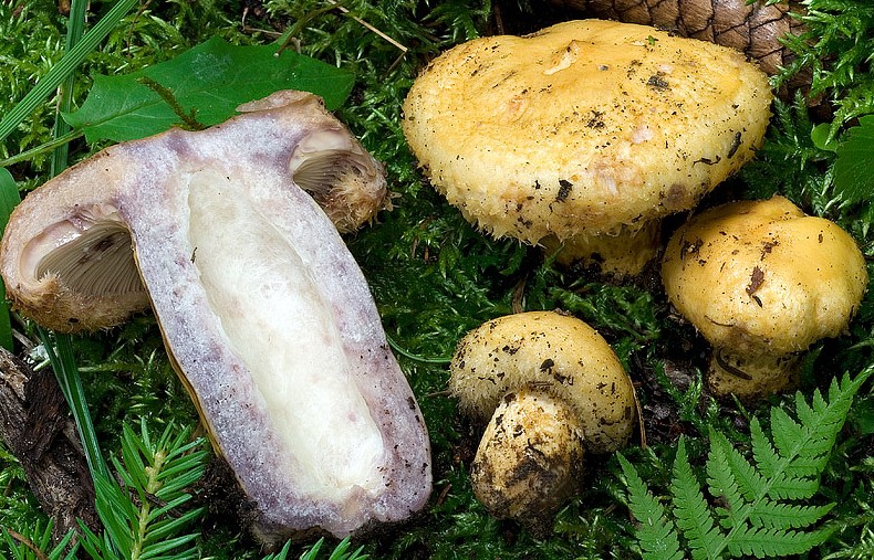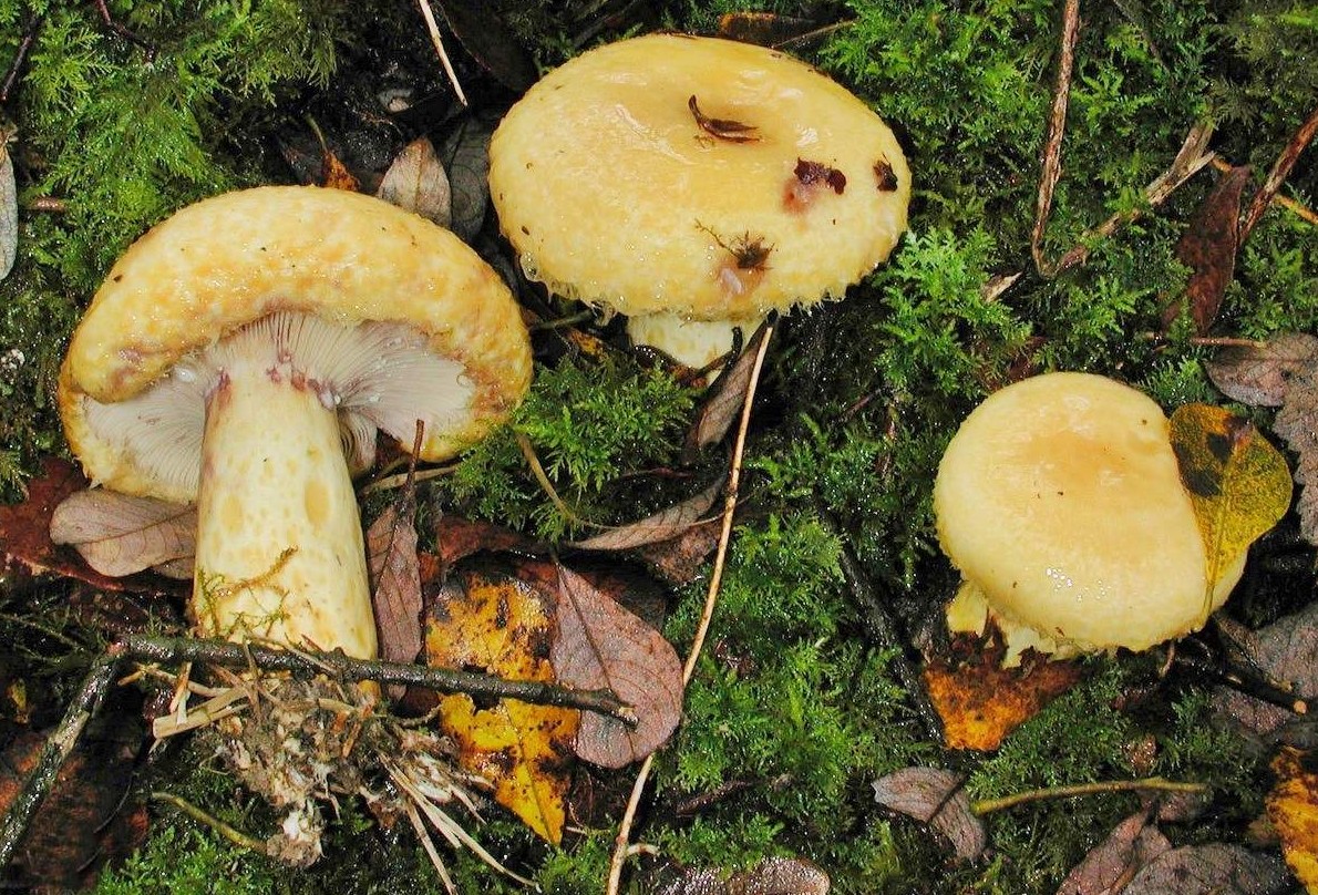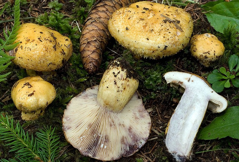 Достаточно часто в лиственных и смешанных лесах, там, где повышена влажность, встречается груздь синеющий. Он имеет выпуклую шляпку, которая в процессе развития приобретает форму воронки и покрывается мелкими чешуйками. Цвет ее колеблется от желтого до насыщенно-желтого. При повышенной влажности шляпка становится клейкой. Пластинки у этого гриба незначительно нисходящие, тонкие и имеют бледно-желтый оттенок.