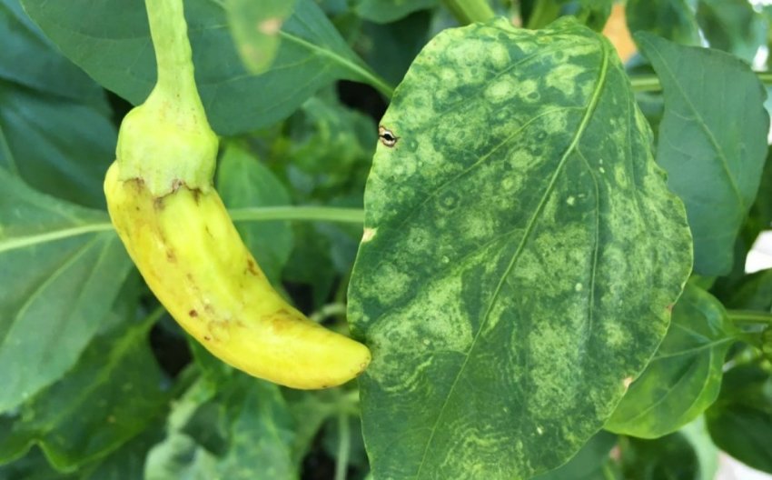 В теплице перец часто подвергается нашествию паутинного клеща. Симптомы заражения: «мозаичные» желтые пятна на листьях и белый налет паутины, под которым передвигается микроскопическое насекомое.