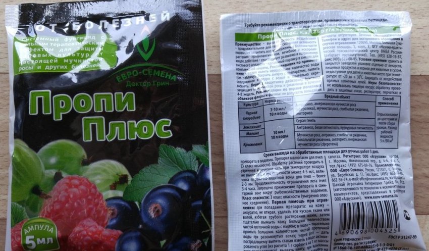 Для опрыскивания от болезней используют медьсодержащие препараты (бордосскую жидкость), также хорошо зарекомендовал себя фунгицид Пропи Плюс.1 ампула разводится на 5-7 литров воды, этим раствором опрыскивания проводят только после сбора урожая ягод с кустов и весной до цветения. Действие препарата продолжается 1-2 месяца в зависимости от погодных условий.
