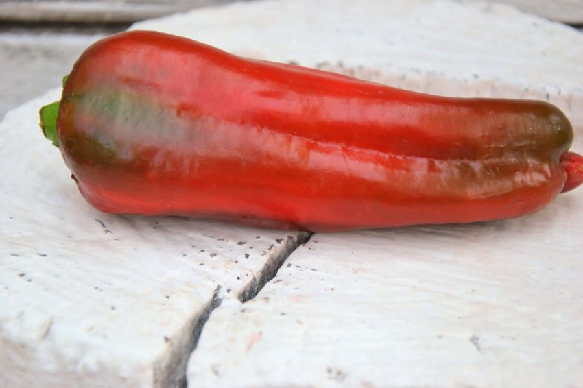 Ярко-красные стручки вырастают иногда до 25 см длиной. Форма плода удлиненная, конусовидная, с глянцевой поверхностью. Масса одного перца — до 200 г. Стеночки тонкие 4-5 мм, сочные и сладкие с нежной структурой.