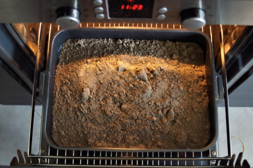 Влажную землю насыпают на металлический лист слоем не больше 5 см и полчаса выдерживают в разогретой до 70-90 градусов духовке.