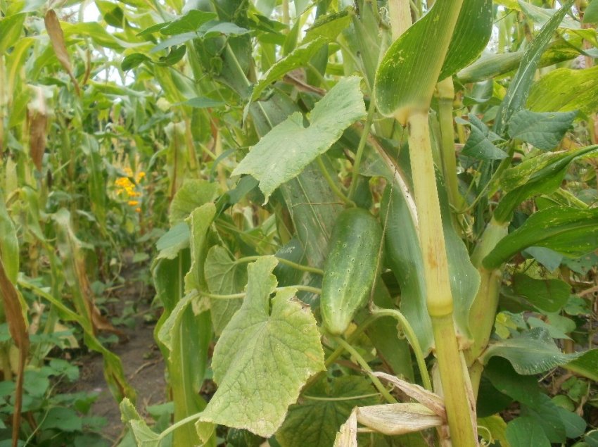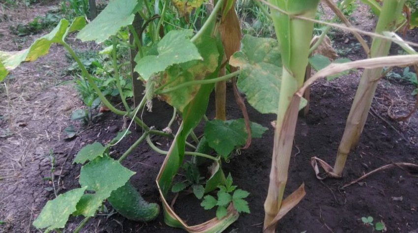 - если не заниматься формированием огуречных плетей, они пагубно отражаются на урожайности кукурузы, т.к. усики уничтожают стебли у злака. Поэтому его стоит посадить немного раньше зеленцов;