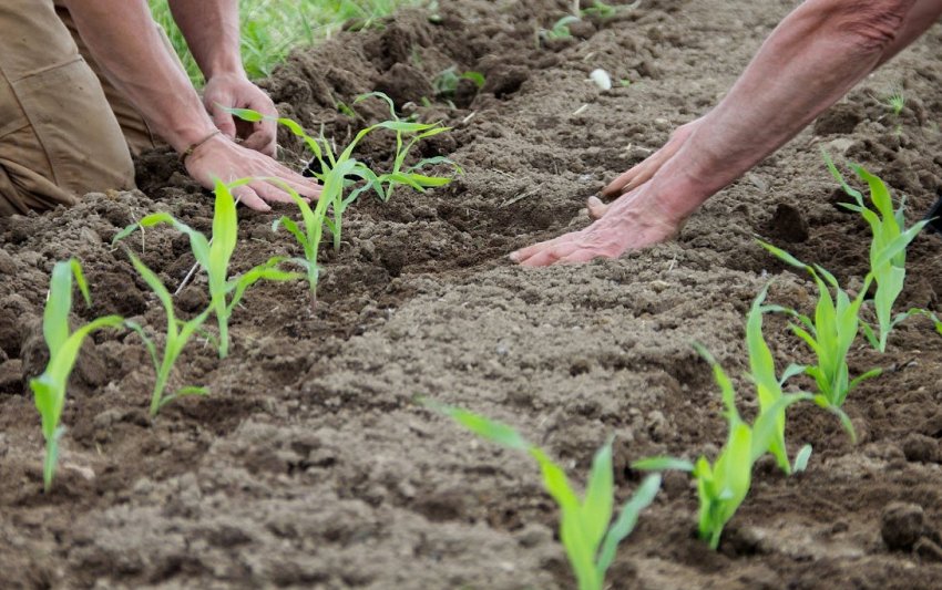 После появления первых огуречных и кукурузных ростков, в лунки нужно подкормить перегноем из расчета 50 кг на 10 м2. Аграрии осенью вносят и свежий навоз. Насытить почву питательными компонентами может и калийная соль, селитра, двойной суперфосфат. Саму грядку замульчировать. Благодаря такому простому подходу можно сократить число сорняков, и уменьшить поливы.