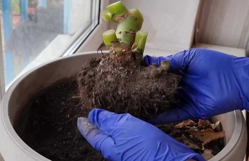 Если клубневая бегония продолжает оставаться зелёной, а вам необходимо убрать растение в хранилище, то можно срезать зелёные стебли на высоте 5-10 см от земли. Если выламывать или обрезать стебли до основания, то верхняя часть клубня может начать гнить.