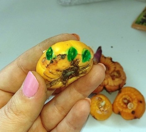 - Все пятнышки нужно вырезать острым ножом и замазать зелёнкой. Если не убрать больные места, они будут разрастаться, из-за чего клубни будут медленно прорастать, растения получатся слабыми и могут не зацвести.