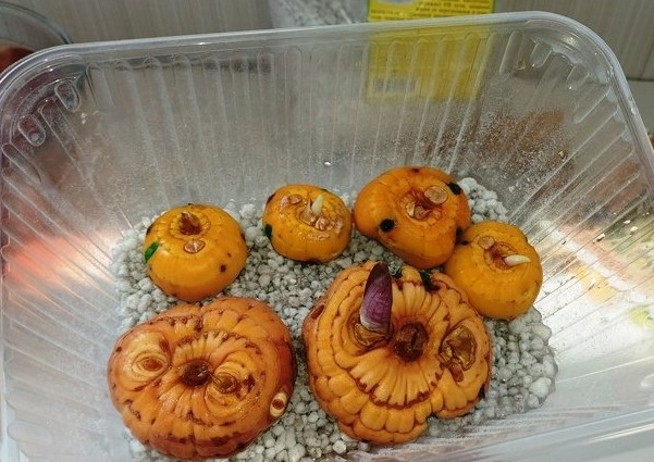 - Гладиолусы раскладываю в один слой для проращивания и размещаю в прохладном светлом месте, где температура +15…+20 градусов.