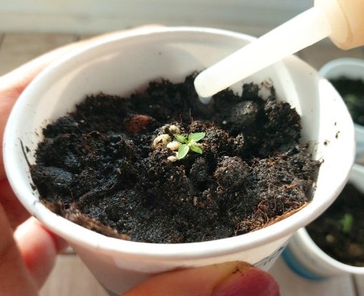 - Землю в стаканчиках не приминаю, осторожно досыпаю землю вокруг растений, стараясь не засыпать их.