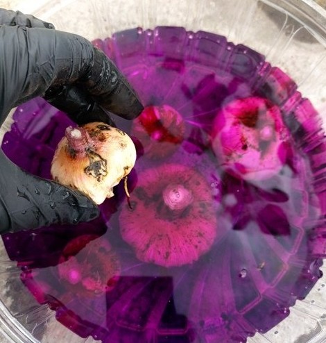 - После обрезки клубнелуковицы гладиолусов следует обеззаразить от грибковых заболеваний. Для этого их нужно замочить в ярко розовом растворе марганцовкина полчаса.