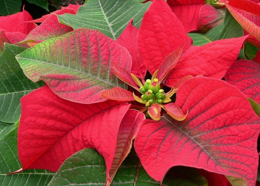 Пуансеттия – яркое декоративное растение с красными листьями на верхушках побегов. Нижние листья на веточках зелёные, а ярко окрашенные листья растения – это прицветники и если присмотреться, то на верхушках побегов можно увидеть мелкие бутоны или цветочки, если их не будет, то и нарядное украшение пуансеттии – яркие прицветные листья не появятся.