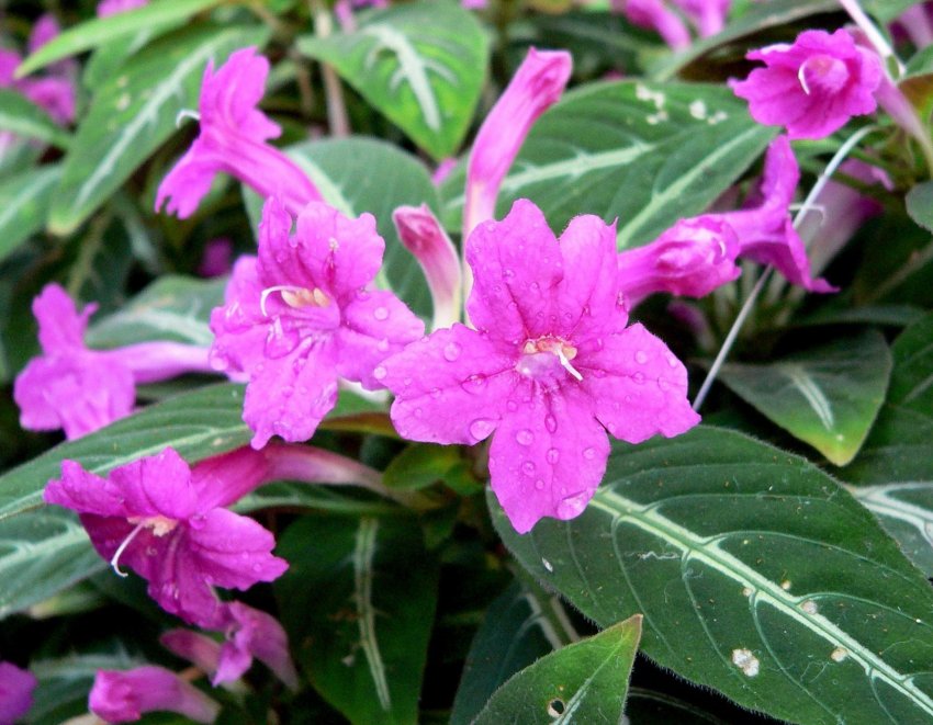 Побеги руэлии украшают удлиненные бархатистые листья, наиболее декоративны виды руэлий с листьями, имеющими выделенные светлые прожилки.