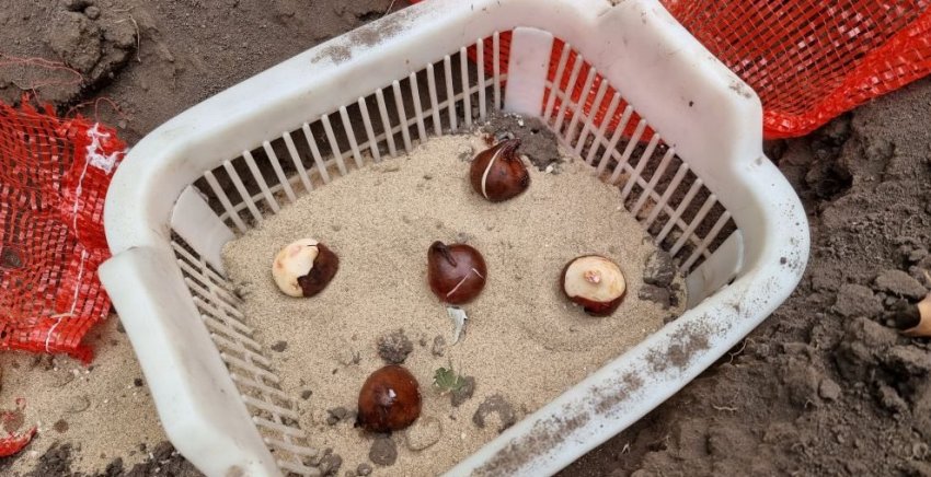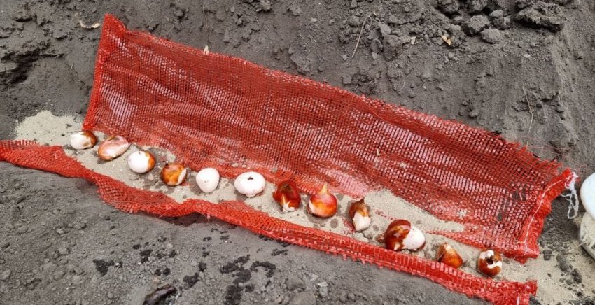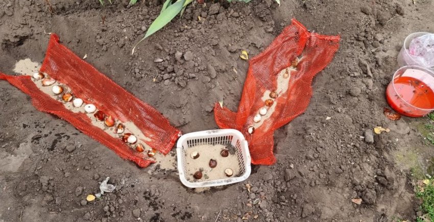 При засыпании борозды с сеткой нужно закрепить её края, чтобы материал не свалился с боковых сторон борозды, и сетка не закрыла луковицы сверху. На следующий год будет легко откопать у поверхности края сетки и извлечь все луковицы.