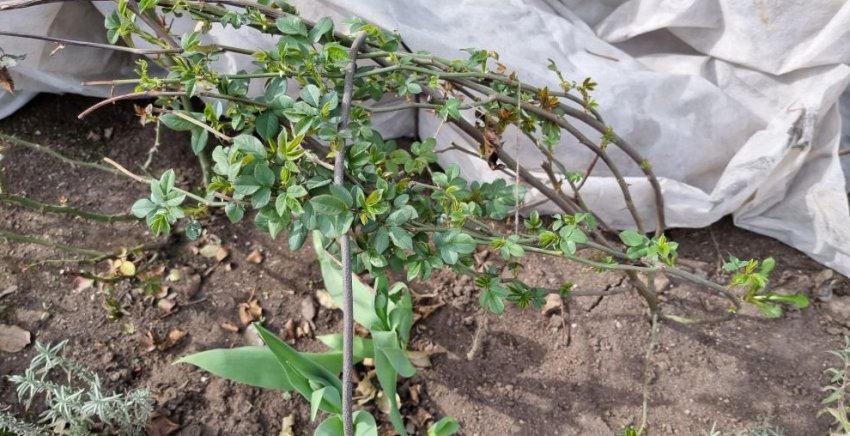 Вначале куст связываю в пучок в нескольких местах по высоте. Затем куст пригибаю к земле и закрепляю дугой, которую втыкаю в землю отступив от основания куста не менее 50 см и побеги пригибаю не до самой земли, а до высоты 40-60см.