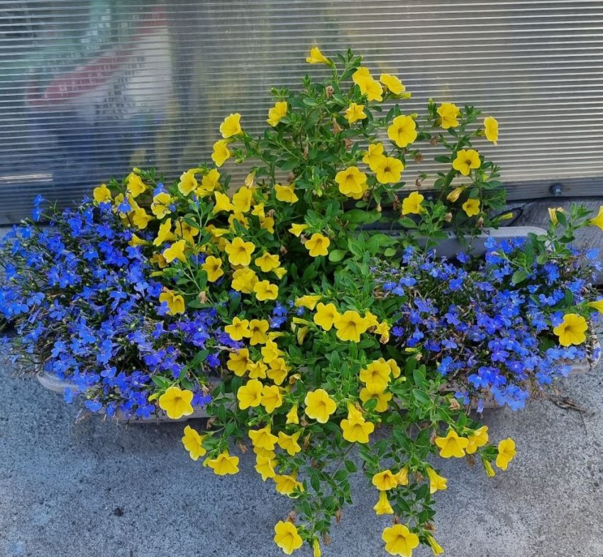Калибрахоа посаженная в небольшой ящик да её с соседкой лобелией прекрасно смотрелась благодаря константному сочетанию. Эта калибрашка разрасталась медленно, так как объём земли не позволял и стояла на солнечном месте, но под навесом, поэтому растение от дождей, ливней было защищено. Это растение у меня к осени перецвело даже лобелию и несмотря на небольшой объём грунта превратилась в пышный разветвлённый кустик.