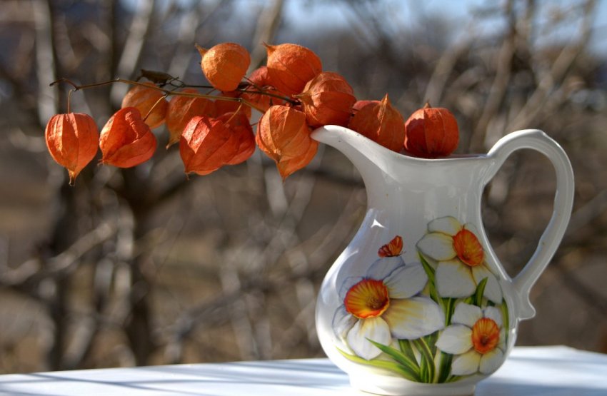 Срок сбора физалиса растянут – он вызревает ярусно. Ориентир – подсохший «фонарик» и насыщенно-оранжевый цвет ягодки. Заготовку нужно закончить до осенних заморозков – растение их не переносит. Просушивают до тех пор, пока коробочка не станет тонкой, прилипая к ягоде. Складывают плоды (в кожуре) – 1-2 слоя — в коробки с вентиляционными отверстиями и хранят при +12-14 °C – от 2-х до 5-ти месяцев (главное – вовремя удалять подпорченные ягоды).